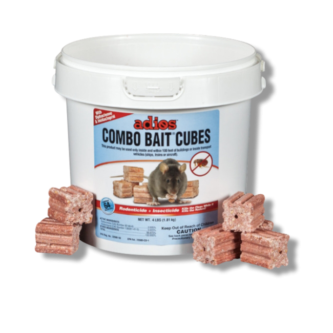 Adios Combo Bait Cubes, manufactured by Kaput, are bait blocks that act both as a rodenticide and insecticide since they contain active ingredients that can kill both rodents and the fleas that accompany them.