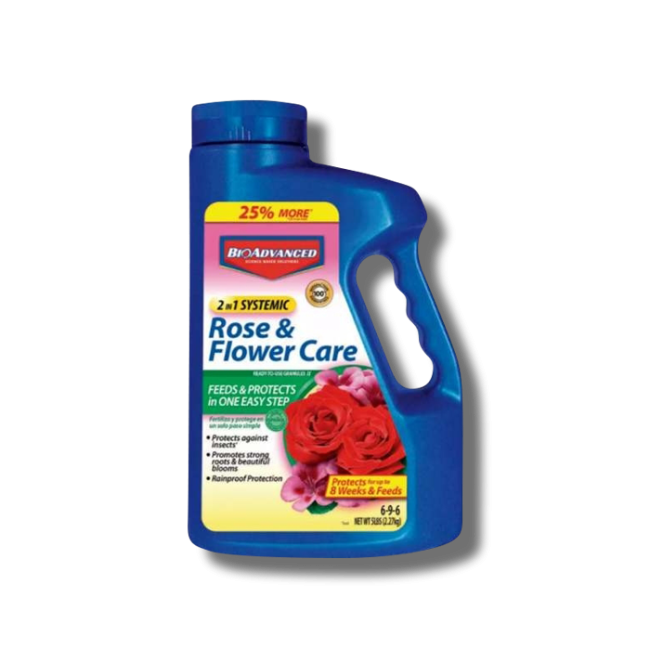 Bio-Advanced 2-In-1 Systemic Rose and Flower Care is a ready-to-use granule that will help feed and protect your plants from insects. This product contains a 6-9-6 fertilizer, which will help your ornamental plants bloom and increase their root strength.