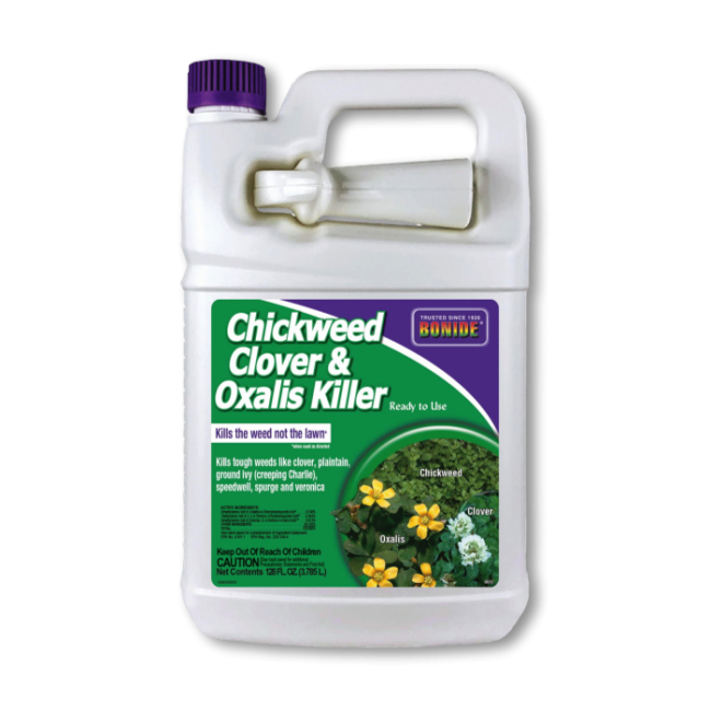 Bonide Chickweed, Clover, and Oxalis Killer RTU is an easy-to-spray post-emergent herbicide that maintains strong control over numerous broadleaf weeds even after light rain or watering within hours of application.