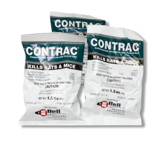 Contrac Pellet Place Pacs, manufactured by Bell Laboratories Inc., are rodenticide bait pellets that come in pre-measured packets and control various types of rats and mice.