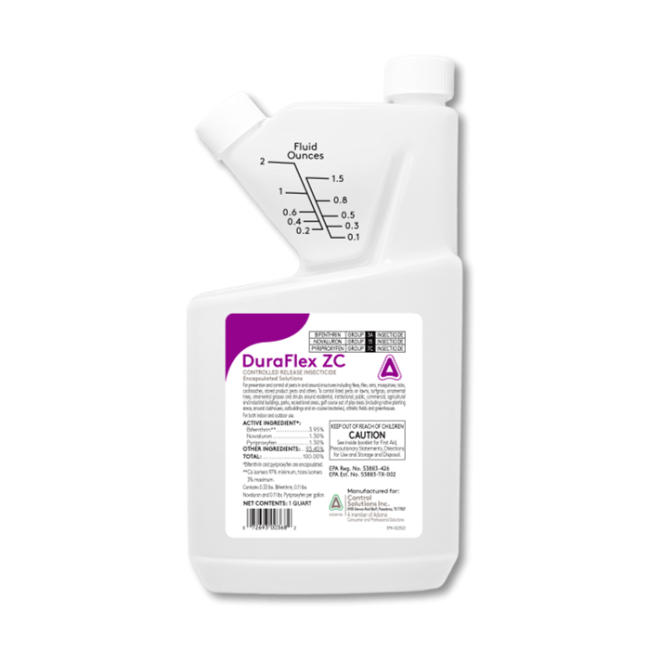 DuraFlex ZC is the first microencapsulated insecticide that contains three modes of action: bifenthrin 3.95%, novaluron 1.3%, and pyriproxyfen 1.3% that will break the life cycle of the pests by inhibiting their ability to grow and reproduce.