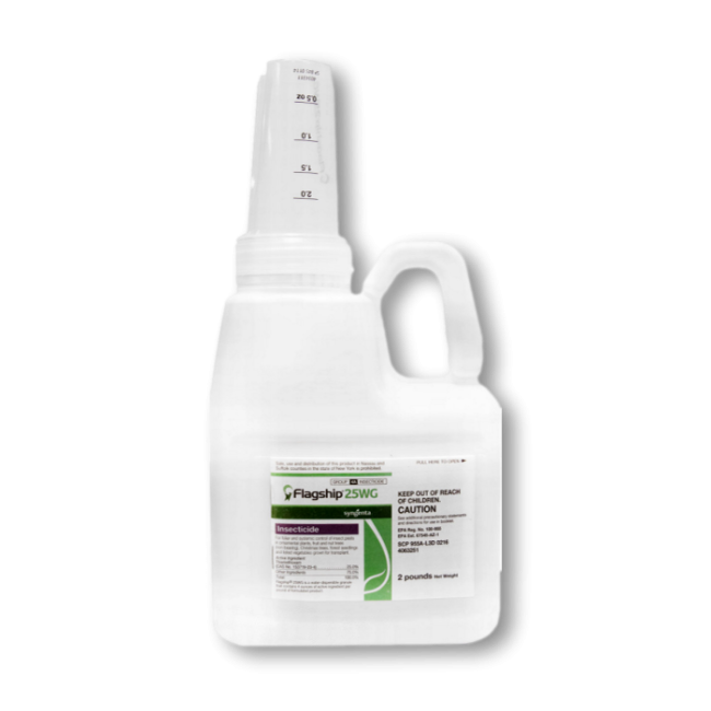 Flagship 25 WG Insecticide, manufactured by Syngenta, is designed to control plant sap-sucking and chewing pests found on landscapes, croplands, soil and ornamentals. It has shown to be especially good in controlling infestations of aphids, thrips, whiteflies and other similar pests that damage plant life.