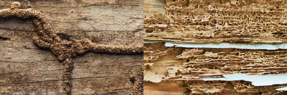 Other termite species, such as drywood termites, create galleries below the surface of the wood. If you remove the wood or it's exposed in a way, you will see large smooth tunnels connected by a series of smaller tunnels.