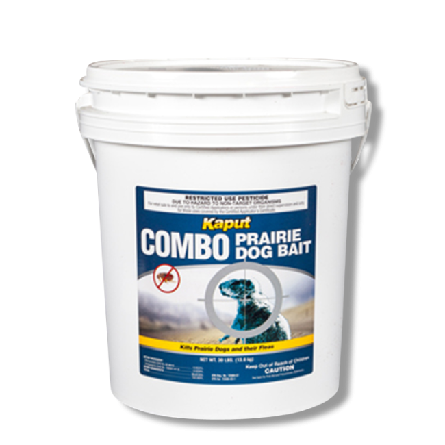 Kaput Combo Prairie Dog Bait is manufactured by Kaput Scimetrics and granular bait created for the control of black-tailed prairie dogs and their fleas. Kaput Combo Prairie Dog Bait is a restricted use pesticide (RUP) and comes in either a 30 lb bucket or a 50 lb bag. This product contains oats as opposed to wheat, which is found in our other Kaput prairie dog bait product. This product not only targets Prairie Dogs, but it also affects their fleas.