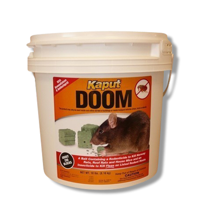 Kaput DOOM, manufactured by Kaput Scimetrics, is superb rodenticide bait that has a combo killing power of imidacloprid and bromadiolone that will not only eliminate the rodents found in your home but their fleas and as well, giving you total protection of both rodents and the fleas that might be left behind.
