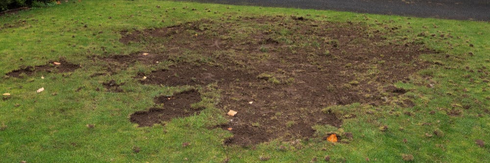 Northern masked chafer grub damage typically appears as irregular patches of wilted, yellowing, or thinning grass that may look drought-stressed, even when watered.