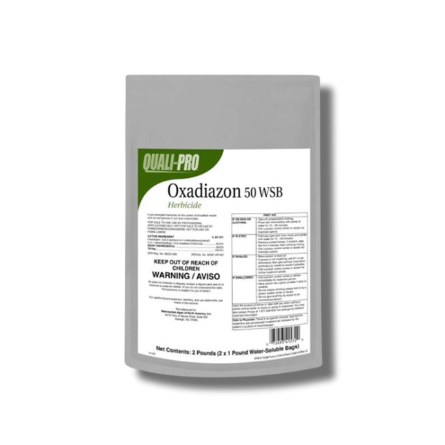 Oxadiazon 50 WSB, manufactured by Quali-Pro, is a high-quality pre-emergent herbicide that comes in water-dispersible granule form. It controls targeted weeds by stunting the development of seeds at the beginning of the germination phase.
