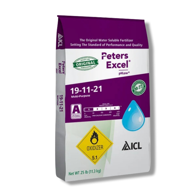 Peters Excel pHLow 19-11-21 Multi-Purpose with Black Iron, manufactured by ICL Specialty Fertilizer, is a flexible water soluble fertilizer that contains a complete range of essential micronutrients and three chelated irons in the right ratios to match specific nutritional needs for ornamental plants.