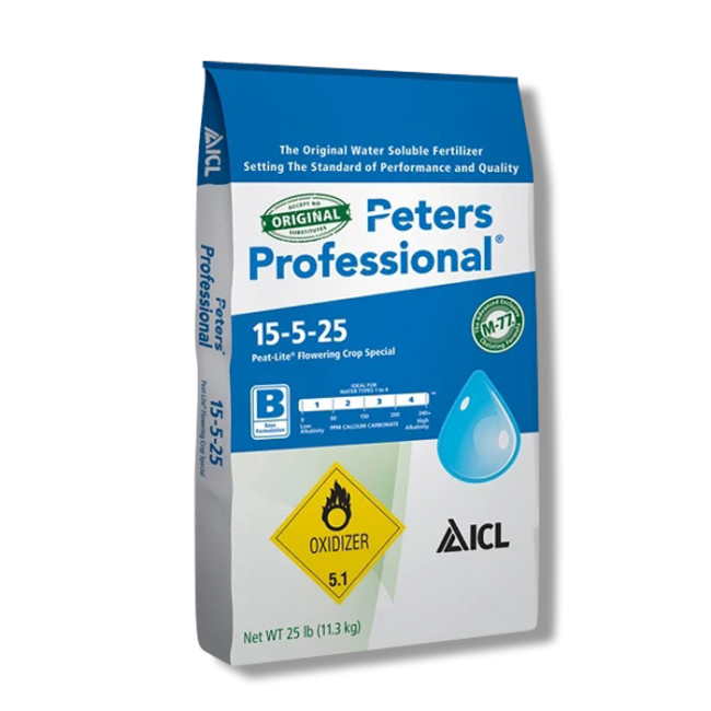 Peters Peat Lite Special 15-5-25 Flowering Crop Special, manufactured by ICL Specialty Fertilizer, is a high-efficiency fertilizer designed to quickly dispel nutrients and continuously feed sensitive ornamentals.