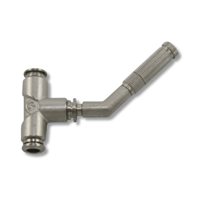 The 45 Degree Tee Nozzle is designed to connect multiple pieces tubing lines to spray mosquito control products around various outdoor areas. This product is made with a 1/4" all metal push-to-connect tee, a nickel plated, brass 45 degree adapter, and a stainless steel nozzle to ensure it withstands various weather conditions.
