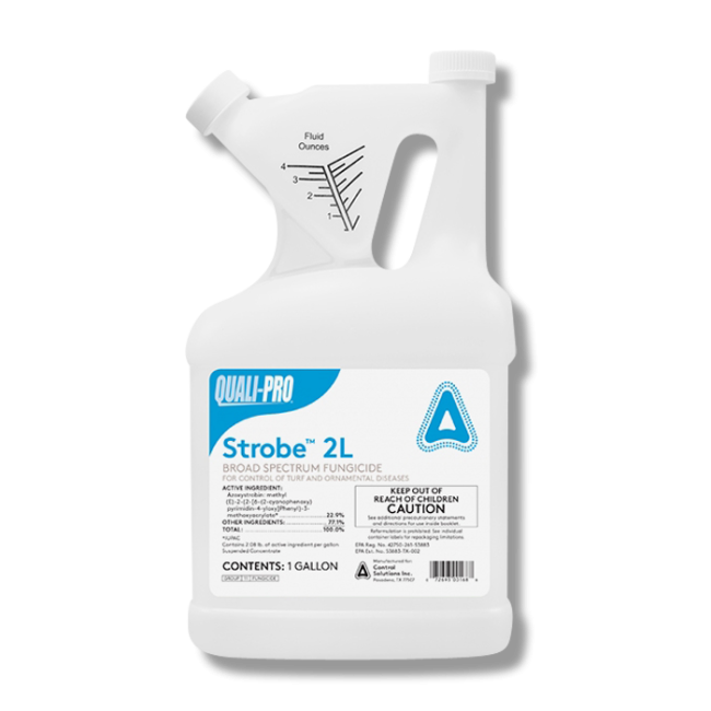 Strobe 2L is manufactured by Quali-Pro and is a liquid fungicide that that can prevent and cure fungal disease on turfgrass. Strobe 2L contains Azoxystrobin, an active ingredient that is highly systemic and can be transported upward into the plant, protecting the plant from disease development from the roots to the tips of the leaves. Use Strobe 2L as a standalone foliar spray or mix it in a tank with other pesticides to get rid of disease like Brown Patch, Anthracnose, Downy Mildew and others.