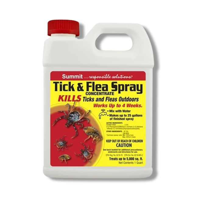 Summit Tick & Flea Spray, manufactured by Summit Chemical, is a powerful insecticide that quickly removes ticks and other pests such as fleas from outdoor landscaped or bushy areas.