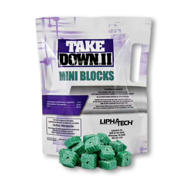TakeDown ll Mini Blocks is a fast-acting bait that requires a single-feed for rats, mice and other rodents to consume a lethal dose. Due to its convenient mini-block size, this product can easily be placed in various bait stations and confined spaces.