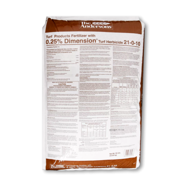 The Anderson's 21-0-10 Fertilizer w/ 0.25% Dimension, manufactured by the Andersons, is a quality 2-in-1 product for cool-seasoned turf and warm-seasoned turf that prevents broadleaf and grassy weeds, kills emerged crabgrass and fertilizes your lawn and ornamental turf.