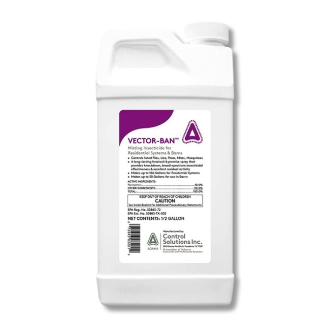 Vector-Ban is an insecticide used to control various insects. It controls flies, lice, fleas, and mosquitoes around residential and livestock areas. Vector-Ban can be used in automatic mosquito misting systems or as a broadcast spray.