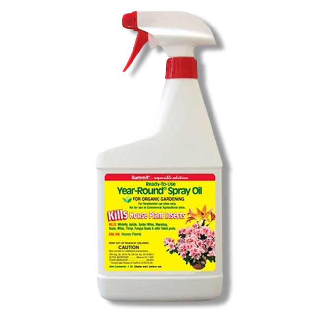 Year-Round Horticultural Spray Oil For Houseplants, manufactured by Summit Chemicals, is a premixed liquid product that can easily be sprayed onto indoor houseplant surfaces through its convenient trigger spray container.